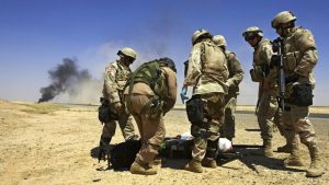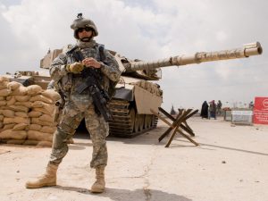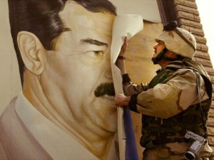 SAFWAN, IRAQ – MARCH 21: U.S. Marine Major Bull Gurfein pulls down a poster of Iraqi President Saddam Hussein March 21, 2003 in Safwan, Iraq. Chaos reigns in southern Iraq as coalition troops continued their offensive to remove Iraq’s leader from power. (Photo by Chris Hondros/Getty Images)