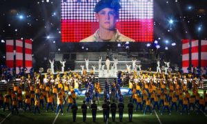 يُعد حضور فريق دالاس كاوبويز في مراسم استراحة منتصف المباراة، مع عرض مشجعات الفريق بجانب أبطال الحرب، رمزاً لاختزال دور النساء إلى أدوات عرض. ويعكس هذا التناقض نقداً واضحاً للخطاب الجندري السائد داخل بنى السلطة والسرديات القومية.